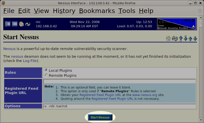 For this example, we will simply press the button to setup and start the nessusd service using the default settings.