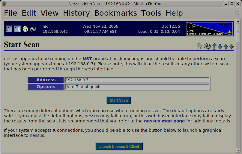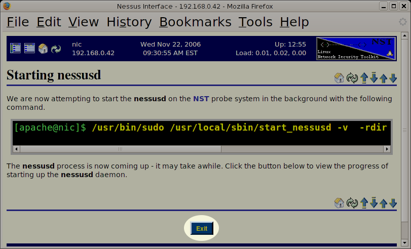 Now that nessus is setup and running, we'll select the "Home" icon on the top navigation bar to return to the main index page. From there, we'll go back to the Inprotect page as described in the "Finding Inprotect in the NST WUI" section.
